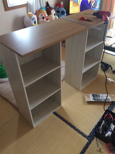 カラーボックス2つと天板を用意して息子ちゃん用のラックを作りました。 手順としては 1.カラーボックスを組み立てる 2.カラーボックスに天板を固定するための木ダボ用の穴を開け木ダボを埋める 3.天板に木ダボ用の穴を開ける 4.天板とカラーボックスを合わ…